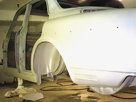 As you will recall from our last issue, Bob at The Works has been working on a full restoration of Carolyn's Amazon. When we left off previously, the body had returned from the sandblaster and Bob had sprayed it with a coat of primer and begun to correct dents, rust and prior repairs that weren't up to the standard required for this project.