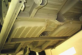 You'll remember the replacement box section from the floor from Part 1 (the repaired section is in the lower left of this photo). As it turned out, the same piece on the passenger side was also rusted to the point that it was replaced too, as well as two or three other sections that had rusted through in other areas of the floor. This photo shows the underside of the car after those repairs and before seam sealing. |