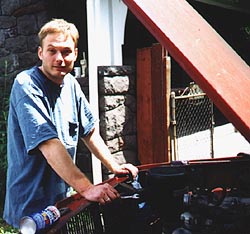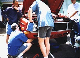 Well, timing was problem number one -- Cam gradually advanced it from 10 degrees after TDC while I cranked the idle screw on the car's brand new Weber DGV out to keep the rev's at something approximating idle speed. Not that it wanted to keep running at idle -- I started cranking the idle mixture screw out as well. In about two minutes, we had it idling pretty well, although it was obvious the Weber was grossly misjetted, the valve adjustment was only halfway close and the throttle linkage wouldn't open the carb's secondary barrel at all. We explained what further work would need to be done, but we had other, more pressing problems at the moment. New guy was pretty happy with the improvement, even like it was. The prospect of picking up the nose of a 140 by hand soon removed any smugness we may (or may not) have felt from making the new guy's car run better, but the solution did eventually dawn on us: put the rear jack stands more towards the center of the car so the weight of the back end would help us out as much as possible. With some careful positioning and a lot of analysis about just which way things would shift when we hefted the front, we were soon able to pick up the front somewhat. The front would have to come way up, though, so a few trial runs showed that we'd have to take it in small stages. Four people would lift, while another two would notch the front jack stands up higher and higher. Even at that, considerable effort was required -- I guess none of us is exactly Mr. Universe. New guy had, somewhat unhelpfully, plopped himself down in the shade of the garage and was watching with some interest. As those of us participating gave one particularly red-faced heave, he casually asked, "Is that heavy?" The answer squeezed out through clenched teeth: "It's . . . a . . . CAR!" We had to set it down pretty fast that time. Fortunately, the pizza arrived about then, so we all got to take another break.