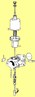 If that seems too simple, well, it is. Remember, we want the fuel flow to be proportional to the airflow rate, not the level of vacuum. We might easily have the same vacuum level at 2000 RPM as at 6000 RPM, and the motor will pump far more air through its cylinders (and need more fuel) at the higher revs -- but it's only vacuum that's making the fuel flow in the first place. An additional mechanism is needed to keep the mixture at the stoichiometric ratio -- and that's what the dome-and-piston affair on top of the carb is all about. Into the top of each jet is inserted a precisely tapered needle, thin end down. When the thick, top part of the needle is down blocking most of the jet, little fuel gets sucked into the airflow; when the needle is lifted so the skinny part presents less obstruction, more fuel is delivered. The dome is ported from the front (the upper two holes in the face of the carb body) and the piston is ported at the bottom in such a way that the pressure in the dome drops in proportion to airflow through the carb. In a nutshell, this arrangement makes its own vacuum separately from the manifold vacuum, thereby drawing the piston up into the dome and pulling the attached needle up out of the jet. Upward movement of the piston is dampened by oil (in a dashpot in the center of the dome) to prevent overshoots and oscillations. Fuel flow is therefore affected by both engine-generated vacuum in the carb body and airflow-generated vacuum in the dome. If the needle's taper is properly matched to the airflow characteristics of the motor, the resulting mixture will be close to correct across a wide range of throttle openings and RPM. It works pretty well when it's working right.