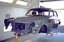 Marsha Singher singher@pacifier.com It's been a while since we've gotten back to Bob at The Works. Carolyn's Amazon is coming along nicely. When we left off previously, Bob had sprayed the body with several coats of primer and was sanding each coat to make sure that the shape and structure were perfect before the car was painted. A mid-70s "Stork Blue" from the 240 series was chosen by Carolyn for the body color, a test panel was sprayed and approved, but when the whole body was painted, she decided that the car was "too blue." She and Bob looked at earlier stock colors and chose the mid-60s "Slate Blue." The body was re-sanded and the new color applied. It looks just great! The body panels were hung, aligned and painted, and the entire car was clear-coated. While the paint was curing, Bob took the engine apart and ordered the parts necessary to rebuild it, including new pistons, bearings, camshaft, oil pump and timing gears. Meanwhile the chrome has just returned from the platers and looks just like new.