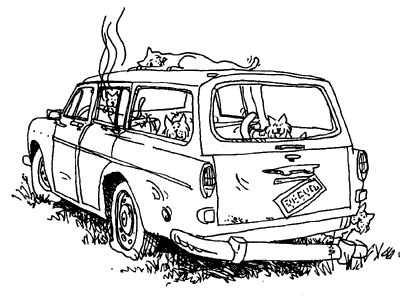 D. Donovan donovand@pilot.msu.edu Drawings by Dean Vavak vavak@tconl.com Nothing evoked the feeling of dread in those years like the phrase, "Honey, I got it for the right price!" Generally it was a car and the car was generally worth precisely what was paid. The "Kitty Hotel" sticks in my mind as the ultimate example. A 122 station wagon free for the hauling that sat in the back yard of a house in the city for years, serving as lodging for various stray cats. The cats gained access through a hole in the rotted out floor and each tenant took care to mark this car as his own. It was the only time I've ever opened up a car and hosed down the interior. After applying a bottle of Lysol and a few days of airing out it was tolerable, but I was never too particular about locking it or taking the key out of the ignition.