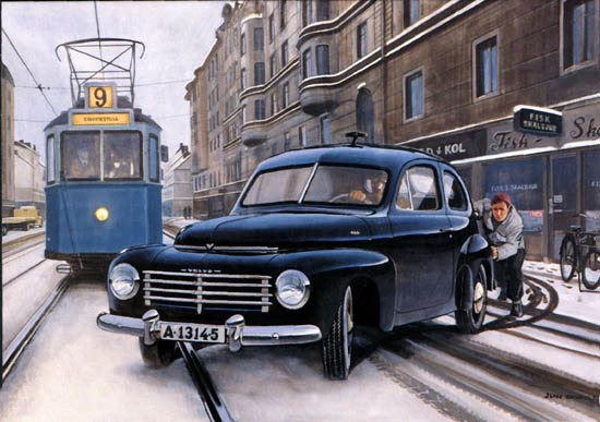 ![]() This painting by artist and designer Sune Envall portrays an event so typical not so long ago, all over the world. At least where automobiles and winter conditions mixed. The scene is set in old Stockholm. Sune informs us that while the fish shop on the right is on that street, artistic license allowed for its move of 50 meters. The good old days may have been both good and old, but tires have come a long way since then and in the case of Volvos in some markets, there is no longer the need to worry about carburetors that sometimes rather charmingly either iced up or set fires. Sune's new web site is under construction at: