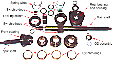 - Similarly remove 3rd gear and its spacers, the horrible snap-ring behind it, 2nd gear and its spacers and synchro ring, and such parts of the second synchro assembly as will come loose. Its hub is cast onto the shaft, so don't even try to pull it off -- the rest of the parts have to slide off from the back.