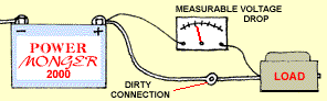 Translating to electrical terms Whether your multimeter has a digital readout or an analog meter movement, it will have two test leads and some sort of dial that switches between measuring volts, amps or ohms. Ohms cannot be measured in an energized circuit, and automotive electrical systems operate on far too many amps for multimeters to handle, so we're going to troubleshoot everything by measuring the relative voltage at various points. Whenever current flows, we can measure a voltage drop from one point in the system and another. A predictable drop just tells us that current is flowing through the resistance inherent in the system. If we see an unexpected drop between two points in the system that are right close together, we've found unwanted resistance -- an obstruction in the "pipe" -- usually due to dirt or corrosion. If we find less drop than predicted, not enough current is flowing. Read the instructions that came with your meter and make sure you know where to plug the test leads in and what dial setting to use to measure 12 volts DC.