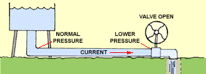 Measure the voltage between the positive battery terminal and the body of the car (ground) -- this is just like checking the pressure in our waterworks model at the pipe bend relative to the well. With the ignition off, you should read 12 volts DC. Now measure from the other end of the positive battery cable, at the big bolt on the starter, to ground. This will read exactly the same because there's no current -- just as the full pressure is felt everywhere in the pipe with the valve closed (if you like, measure from one end of the cable to the other. You should read zero -- remember, you are measuring relative voltage). Now, back to measuring between the positive battery terminal and ground. Crank the car briefly, and observe a drop of a volt or so. Why? Because current is flowing through some internal resistance in the battery, just as the down-pipe in our water model is not entirely "friction free." Measure again at the starter terminal, and observe a slightly greater drop when cranking. Why? Because now you've added in the extra resistance of the cable. Cranking a starter takes lots of current, so even a little increase in resistance will give a noticeable voltage drop. One more thing: measure between the positive battery terminal and ground, start the car and run it up to 2000 RPM or so. Notice that the voltage reads more than 12 VDC at first, gradually dropping to a stable 12 volts. What's going on? Your generator (or alternator) is like a pump that returns water from the well into the tank -- and it has to pump it over the top of the tank, a "height" greater than 12 volts. The voltage regulator is like a float in the tank -- as the tank fills, it gradually closes the valve on the pump. Even a few seconds of cranking lets enough "water" out of the "tank" to cause the "float" to open the "pump valve" fairly wide.