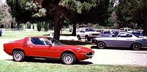 This year, we were number four in a field of fifteen cars. We left the starting marker without incident, and that's when things stopped going right. We were off course in the first eighth of a mile, discovered it We duly pulled in behind car number three, and, in a few minutes, car number six pulled in behind us. Number five was apparently having a nice drive somewhere else and wondering where the heck all the landmarks had gone. Heh, heh. Our stopwatch signaled us onwards. We went happily on our way finding landmarks, turning where directed, speeding up and slowing down until coming to a big intersection with a traffic signal. Traffic signal? There's nothing about a traffic signal in the directions... Aaugh! That wasn't just a speed change back there where the sign said "Jones Road" (all street names are fictitious in case John and Karl feel like inflicting this particular rally on some other clubs), there was a turn, too! On down the road until there's a chance for a U-turn, backtrack, make the turn and drive like heck -- there must be four or five minutes to make up. And so it went. We'd do well for stretches, and then suddenly find ourselves headed up some ranch's drive instead of on the road, turn around, crank for a while, etc. We found ourselves passing the same Alfa over and over again -- they were clearly going too slow (optimistic speedometer?), but we were clearly blowing it. The first checkpoint came as a relief -- a chance to take our lumps and start fresh.