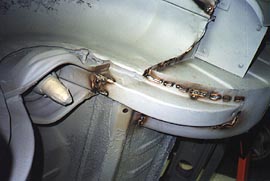 This shot shows the upper left spring seat and spare tire well. The well, left rear fender and rear valance had all been replaced at some point in the Amazon's past. Whoever it was that executed this repair initially didn't fully weld up the new seams, and Bob found that there were several gaps in what should be structural joints. |