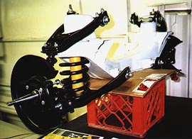 | The most visually impressive change to take place since our last visit is that the front suspension has been assembled and attached to the cross member. This assembly has now been set aside and will wait until final assembly. | ![]() |