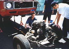 Well, timing was problem number one -- Cam gradually advanced it from 10 degrees after TDC while I cranked the idle screw on the car's brand new Weber DGV out to keep the rev's at something approximating idle speed. Not that it wanted to keep running at idle -- I started cranking the idle mixture screw out as well. In about two minutes, we had it idling pretty well, although it was obvious the Weber was grossly misjetted, the valve adjustment was only halfway close and the throttle linkage wouldn't open the carb's secondary barrel at all. We explained what further work would need to be done, but we had other, more pressing problems at the moment. New guy was pretty happy with the improvement, even like it was. The prospect of picking up the nose of a 140 by hand soon removed any smugness we may (or may not) have felt from making the new guy's car run better, but the solution did eventually dawn on us: put the rear jack stands more towards the center of the car so the weight of the back end would help us out as much as possible. With some careful positioning and a lot of analysis about just which way things would shift when we hefted the front, we were soon able to pick up the front somewhat. The front would have to come way up, though, so a few trial runs showed that we'd have to take it in small stages. Four people would lift, while another two would notch the front jack stands up higher and higher. Even at that, considerable effort was required -- I guess none of us is exactly Mr. Universe. New guy had, somewhat unhelpfully, plopped himself down in the shade of the garage and was watching with some interest. As those of us participating gave one particularly red-faced heave, he casually asked, "Is that heavy?" The answer squeezed out through clenched teeth: "It's . . . a . . . CAR!" We had to set it down pretty fast that time. Fortunately, the pizza arrived about then, so we all got to take another break.