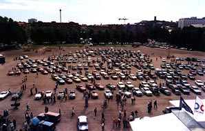 My trip went like this: Orange County, California, to Dallas, Texas; Dallas to London where I hung out for a few days and then London to Gothenburg. My Volvo experience began on Friday with a trip the Volvo factory outside of Gothenburg. Once on the Volvo grounds and signed in, we were given the opportunity to test-drive a nice selection of new Volvos. There were several cars to chose from and, as far as I know, there was no limit on how many of the cars we drove. (We were only asked to obey the speed limit and I did. Really! I think. Those kilometers per hour and miles per hour conversions are so confusing.) Peter Jonsson set yours truly up with an S80 T6 and my new friend Ernst from Holland rode shotgun. It was awesome. I had the time to try others out after Ernst and I got back, but quite frankly I felt as though I had peaked and all I wanted to do was savor the experience. All I can tell you is that it was very fast and very quiet. Next was a tour of the Volvo factory. I shouldn't have been, but I was surprised to find out that Volvo contracts out the fabrication of some of the parts for the new cars, and that those contractors are housed right on the grounds of Volvo for the sake of convenience as well as efficiency. What stood out most for me was watching the robots manipulate the manufacture of the bumpers for the S80. On to the Volvo museum, also located on the grounds. I've seen pictures, but they don't compare to the reality. From the original Jakob to the P1900 to the P1800 prototype to the customized 1969 1800S formerly driven by the president of Volvo to the experimental "Rocket" 1800 that had been considered as a possibility for the design for the 1800ES. There was a jet plane, an intense-looking four-wheel drive vehicle (Ernst tells me he has one), trucks, experimental vehicles, race cars and more. It was a wonderful experience. The people at the museum were great and they even opened up the P1900 for some close-up pictures to bring back to my friend, Dave Hunt, who continues to restore his own P1900. There was a lot to see and, of course, I was the last one to leave. With help from one of the guides from the factory tour, I found my way back to Gothenburg for the Friday night dinner on time. This is where I was first introduced to a very large group of people as the guy who came all the way from California to go to this Volvo meet. Ernst assured me that I hid my shyness well when I more or less stood up and took a bow. Dinner was all the steamed shrimp you could eat and hotdogs for the kids. I tried half a dozen, but to eat them I had to twist off their little heads and clean them while they stared up at me. Not my cup of tea, really, and I opted for a hotdog with the other kids. It struck me funny that I was some 8000 miles from home and eating a hotdog for supper, but it tasted good nonetheless. There was also an indoor display of a number of vintage Volvos. Here I met the first of many Volvo owners and checked out their cars. I got a ride back to my hotel from Marcel and Karin from Holland in their very valuable and beautiful '71 1800E. With the help of VROM coordinators Bo Kruger and Peter Ljungberg, I made it to the rally the next day and hooked up with Martin and Dottie Stickley, an American couple who live in London. Martin owns his own P1900, which he did not bring, but another one of the VROM coordinators, also named Peter, had loaned the Stickleys his completely restored 1958 Duett to drive in the rally. The Stickleys invited me along and I gratefully accepted.