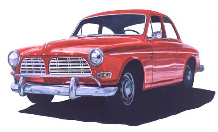 With kind regards, Volvo for life I am 19, and a student at the University of Maryland. In June of 1980, in Buffalo NY, I rode in my first car; it was a 1966-1/2 Volvo Amazon. To this day my father and I still have this car. Please put a picture of it up, we spent a lot of time and effort to make her look this beautiful, and I plan to have it the rest of my life. Your page has been so helpful. I am thinking of writing a nice article of how my Volvo has been with me my whole life (I have pictures with the car from age three and up!). Would you be interested in posting?Sean Bernsohn bernsohn@wam.umd.edu You bet! On all counts. Volvo artI drew this in late 1998 as I was first getting into drawing classic autos. This is my 1967 122S, which was my first car at 17 and which I have had for five and a half years now. In that time it's seen a lot of miles put on it -- it's been driven from my home in Bellingham, Washington, just south of the Canadian border, to LA and back several times now, and two summers ago I drove it on a 120-mile round-trip commute every day on the LA freeways. In September it saw a 28-hour trip from Las Vegas to Bellingham, with (it turned out) a very important bolt missing from the transmission. I discovered that ironman road trips are even more fun if you get to crawl under the car and refill the transmission with oil every time you stop for gas.