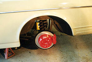Starting with the items listed above, we first painted the new axle, hubs on the rotors and calipers. While the paint was drying (which is a painfully slow process, by the way), we executed step One: Remove Axle. Before loosening anything, support the weight of the car on jack stands and the axle on the floor jack. Next, remove the rear portion of the drive line (mark it if it isn't already, so that you can retain its balance) and the forward ends of the emergency brake cables, unscrew the flexible brake line that connects the hard line on the belly of the car to the junction block on the axle, release the sway bar (if you have one) end links from the moment arms, unfasten the lower shock mounts and, finally, remove the torque rods and trailing arms from their fitting points on the underside of the car. The axle is now free (and unwieldy); lower the jack slowly the springs simply fall out and withdraw the unit from the car. With the two axles side by side, transfer the spring seats, brake lines, junction block (and the screw that mounts it) from the old axle to the new one. You will have to bend the brake lines to get them to meet the calipers; this requires an approximate 90-degree bend in each -- the more graceful you can make these bends, the less chance of damaging the lines themselves. Of course, the closer the lines are to the axle, the less chance that they can be damaged by some odd piece of road debris. Holes or cracks are not repairable; the compromised line must be replaced. Trying to hurry will result in a trip to a shop somewhere that can hopefully make a replacement line sometime in the next however long it takes. . . Note: as you bend the brake lines, they will "work harden." This means that they'll bend fairly easily the first time and become more brittle the more you try to bend them. This is one of those "measure twice, bend once" routines. If you do break one, don't fret: the fittings are fairly common and you should be able to have a replacement made at a local auto parts shop (see above). If your suspension bushings are fairly new, you may elect to reuse them. I'd vote in favor of replacement if they've been in use for more than about 30K, as the opportunity doesn't come around very often, and driving on new bushings is really a nice experience. Either take the torque rods and trailing arms to a shop where the bushings can be pressed, or press them yourself don't try this with a vise; use a suitable press only. Okay: at this point, the new axle is ready and whichever bushings we're going to use are installed in the suspension components. Loosely attach the nuts and bolts to the fitting points on the axle and place the axle on the floor jack. With the help of an assistant, slide the axle under the car and elevate it just enough so that you can loosely install the nuts and bolts which attach the torque rods and trailing arms to the underside of the car. When each of these is in place and finger tight, reattach the lower shock mounts and place the springs in their perches atop the axle. Lift the axle up to the underside of the car until it just begins to hold the weight of the car body. At this point, the suspension is partially loaded and you are ready to do one of two things: fully tighten the suspension hardware; or add weight to the trunk and then fully tighten the suspension hardware. Some folks like to load the car heavy before tightening, the theory being that this will introduce torque to the bushings with the suspension compressed and that this torque will make the car "want" to stay low. I chose to tighten the bushings with the rear suspension loaded to the same degree that it's loaded when I drive it and called it good at that. One item we haven't addressed as yet is the Panhard rod: this is the diagonal rod that attaches the left end of the axle to the right hand underside of the body. Nifty thing, it also prevents the car from sliding sideways off the rear suspension and tumbling off the pavement when cornering. Make sure you install this too.