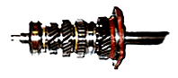 There is one more gear, of course: reverse. Reverse is selected by engaging an idler gear which rotates on its own shaft on the right side of the bottom of the case. Adding an idler to any gear train reverses its direction -- in our application, it causes the mainshaft to spin in the opposite direction from the input shaft. No complex synchronization mechanism is employed (which is why "grinding" will occur if reverse is selected without coming to a full stop) -- the third selector rod simply actuates a lever which slides the idler gear on its shaft into meshing with mating teeth on the countershaft and mainshaft assembly; the latter on the outside of the 1st - 2nd synchro locking collar (which is, you will remember, splined onto the mainshaft itself).