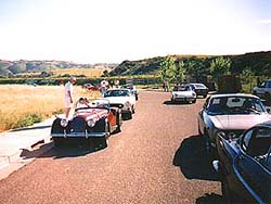 This year, we were number four in a field of fifteen cars. We left the starting marker without incident, and that's when things stopped going right. We were off course in the first eighth of a mile, discovered it We duly pulled in behind car number three, and, in a few minutes, car number six pulled in behind us. Number five was apparently having a nice drive somewhere else and wondering where the heck all the landmarks had gone. Heh, heh. Our stopwatch signaled us onwards. We went happily on our way finding landmarks, turning where directed, speeding up and slowing down until coming to a big intersection with a traffic signal. Traffic signal? There's nothing about a traffic signal in the directions... Aaugh! That wasn't just a speed change back there where the sign said "Jones Road" (all street names are fictitious in case John and Karl feel like inflicting this particular rally on some other clubs), there was a turn, too! On down the road until there's a chance for a U-turn, backtrack, make the turn and drive like heck -- there must be four or five minutes to make up. And so it went. We'd do well for stretches, and then suddenly find ourselves headed up some ranch's drive instead of on the road, turn around, crank for a while, etc. We found ourselves passing the same Alfa over and over again -- they were clearly going too slow (optimistic speedometer?), but we were clearly blowing it. The first checkpoint came as a relief -- a chance to take our lumps and start fresh.